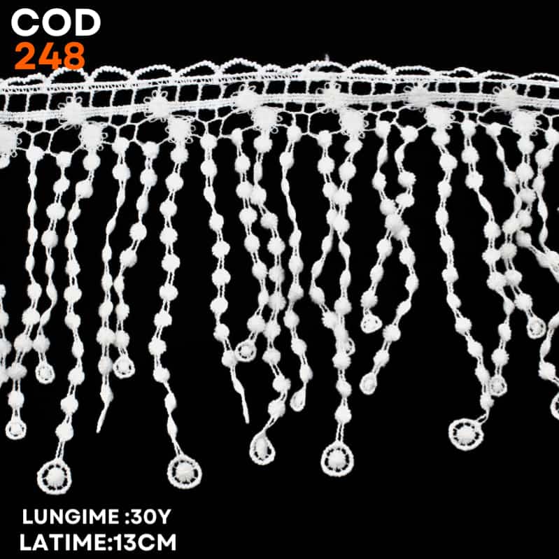 Dantela bumbac cu franjuri cod 248 este o dantela fină ce poate fi folosita pentru a decora bluze, fuste, rochii, lenjerie, etc. Este potrivită, de asemenea, pentru a coase pe fețele de masă și a covorașelor sau pentru confecționarea îngerilor.