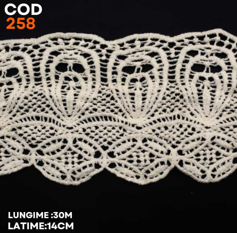 Dantela bumbac cod 258 este o dantela fină ce poate fi folosita pentru a decora bluze, fuste, rochii, lenjerie, etc. Este potrivită, de asemenea, pentru a coase pe fețele de masă și a covorașelor sau pentru confecționarea îngerilor.