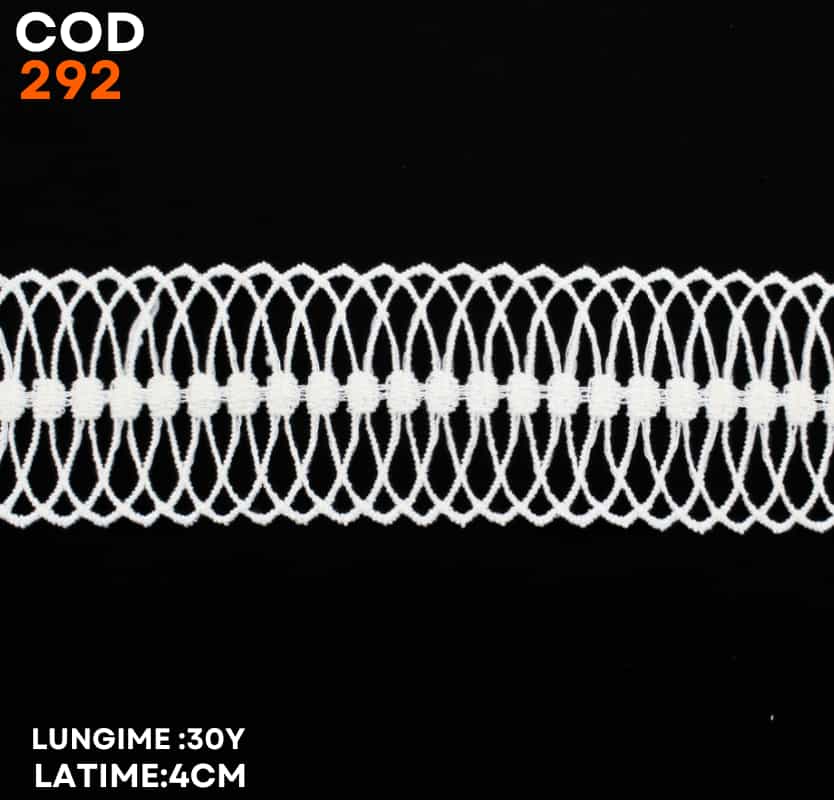 Dantela bumbac cod 292   este o dantela fină ce poate fi folosita pentru a decora bluze, fuste, rochii, lenjerie, etc. Este potrivită, de asemenea, pentru a coase pe fețele de masă și a covorașelor sau pentru confecționarea îngerilor.