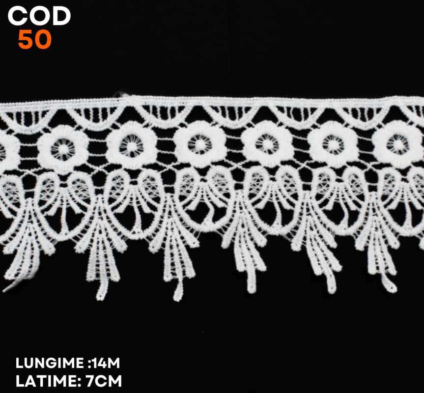 Dantela bumbac-cod 50 este o dantela fină ce poate fi folosita pentru a decora bluze, fuste, rochii, lenjerie, etc. Este potrivită, de asemenea, pentru a coase pe fețele de masă și a covorașelor sau pentru confecționarea îngerilor.