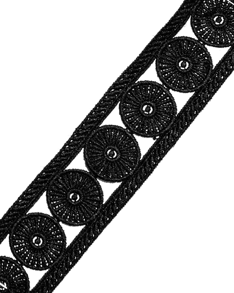 Această dantela prezintă un design atragator având un efect garantat de infrumusetare. Designul este bogat texturat și materialul de bază de calitate. Este potrivita pentru cusut. Technica de aplicare: Coasere. Destinatie: Banda dantela utilizata pentru decorarea confectiilor textile. Se poate coase manual sau la masina de cusut la diferite articole vestimentare de dama de seara, de ocazie, dar totodata se poate lipi cu adeziv special pentru aplicatii haine.