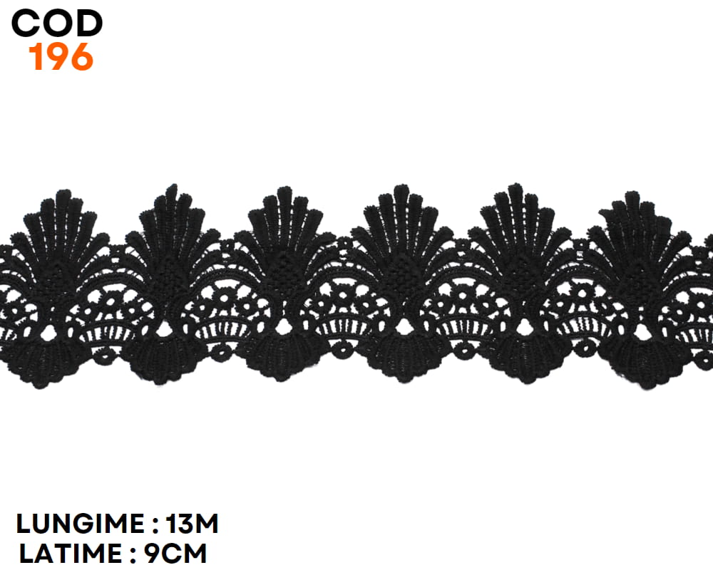 Dantela din bumbac negru este o dantela fină ce poate fi folosita pentru a decora bluze, fuste, rochii, lenjerie, etc. Este potrivită, de asemenea, pentru a coase pe fețele de masă și a covorașelor sau pentru confecționarea îngerilor.