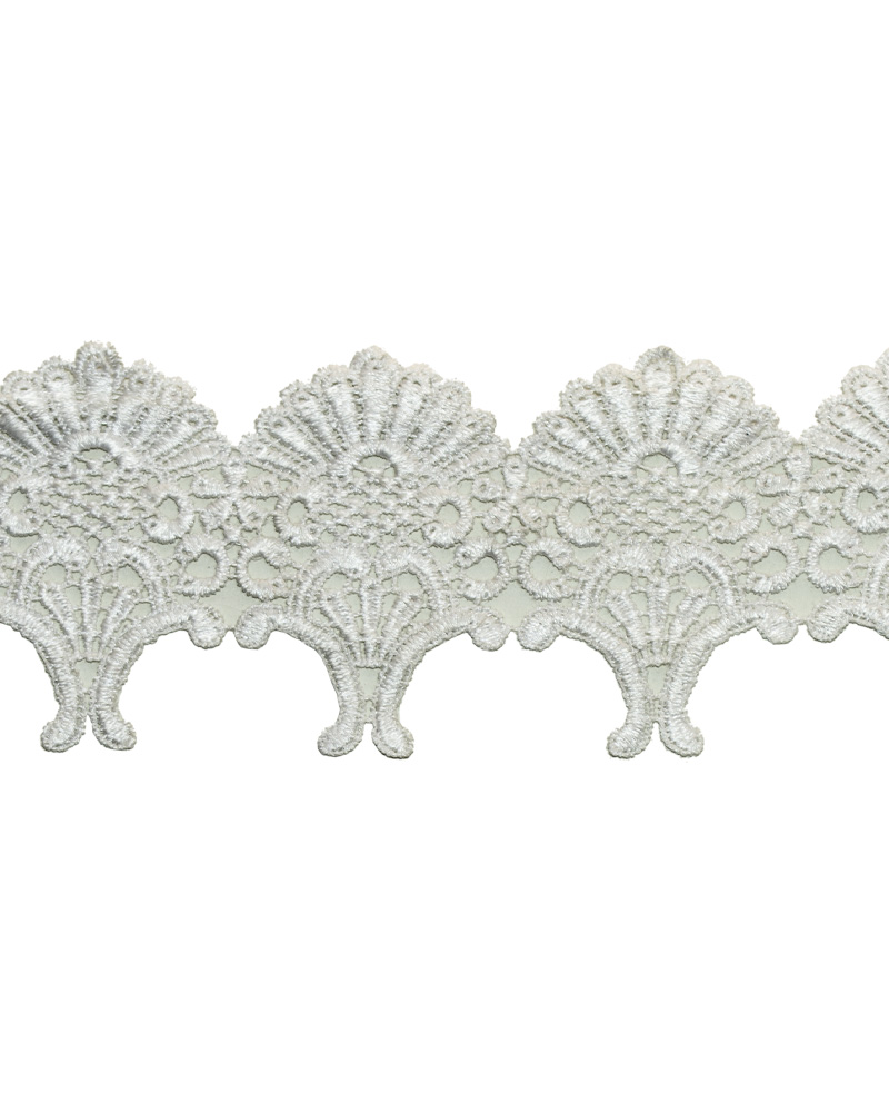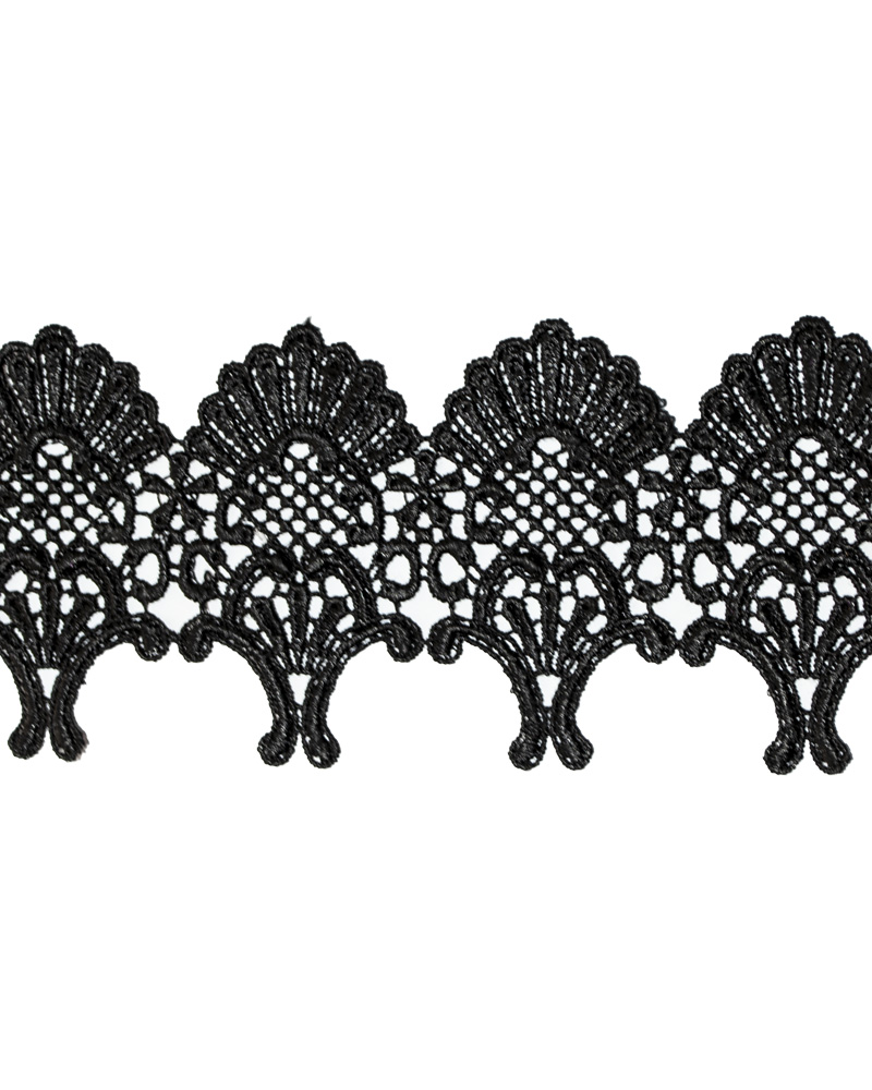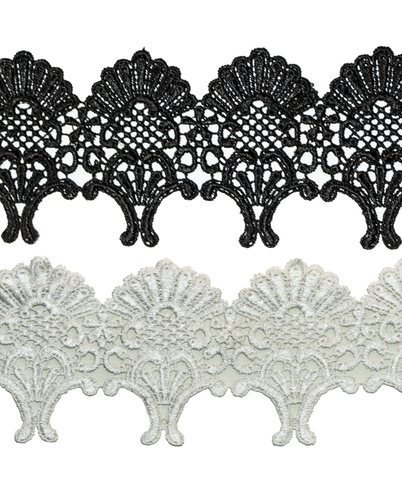 Această dantela sintetica prezintă un design atragator având un efect garantat de infrumusetare. Designul este bogat texturat și materialul de bază de calitate. Este potrivita pentru cusut. Technica de aplicare: Coasere. Destinatie: Banda dantela utilizata pentru decorarea confectiilor textile. Se poate coase manual sau la masina de cusut la diferite articole vestimentare de dama de seara, de ocazie, dar totodata se poate lipi cu adeziv special pentru aplicatii haine.
