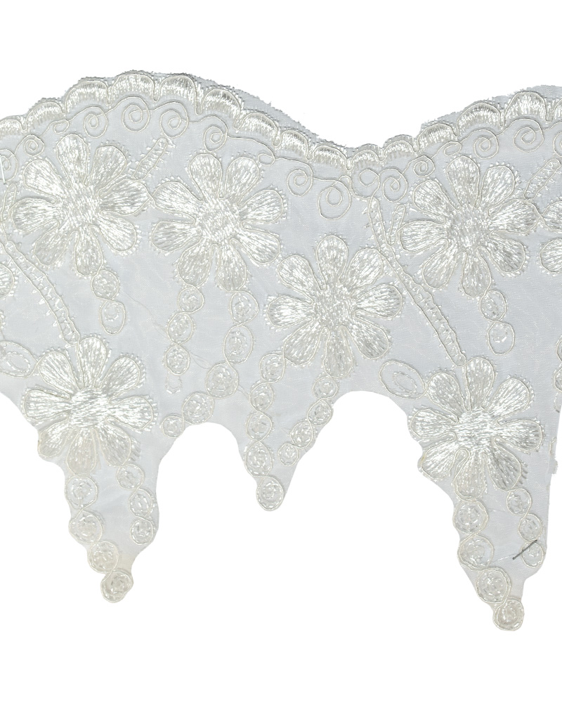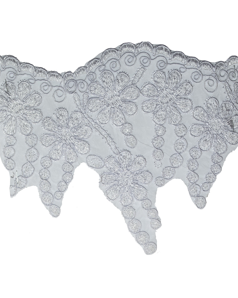 Această dantela sintetica prezintă un design atragator având un efect garantat de infrumusetare. Designul este bogat texturat și materialul de bază de calitate. Este potrivita pentru cusut. Technica de aplicare: Coasere. Destinatie: Banda dantela utilizata pentru decorarea confectiilor textile. Se poate coase manual sau la masina de cusut la diferite articole vestimentare de dama de seara, de ocazie, dar totodata se poate lipi cu adeziv special pentru aplicatii haine.