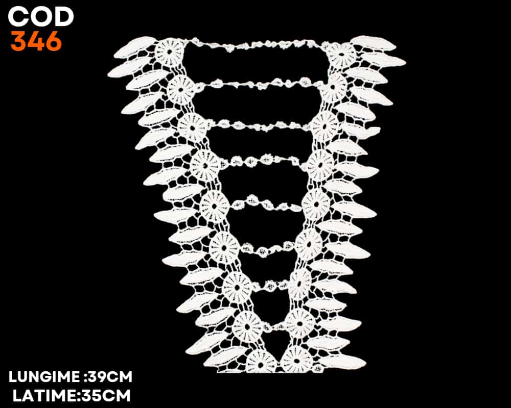 Guler cod 346 este o dantela fină ce poate fi folosita pentru a decora bluze, rochii, etc. Guler din bumbac , model nou , se poate coase manual la diferite tinute de zi sau de seara . Potrivit pentru reconditionarea hainelor