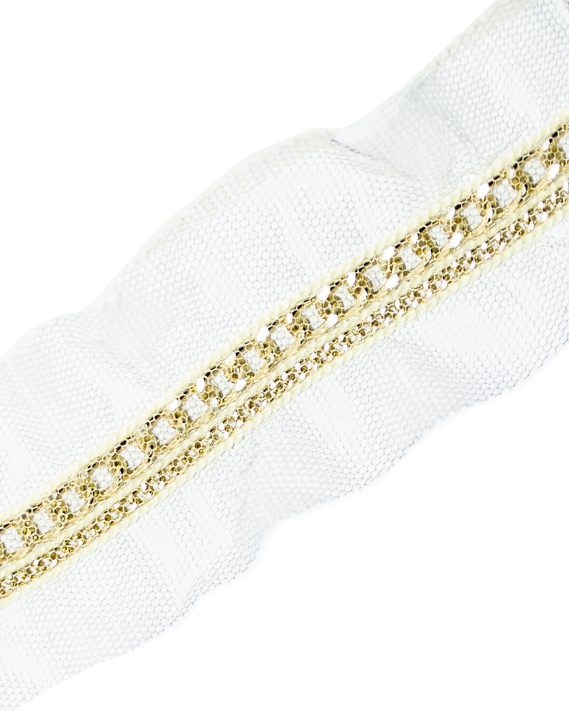 Pasmanterie plisata din tulle (tull) cu lant cusut pe mijloc. Aceasta banda este utilizata pentru decorarea confectiilor textile.